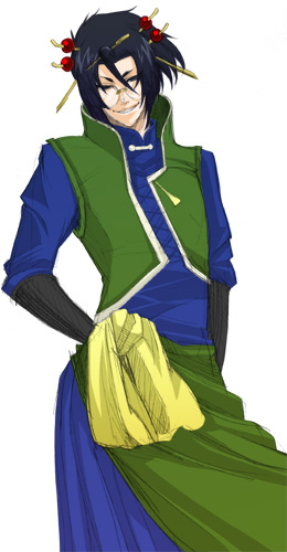 前にも書きましたが、この上着の下がどうなっているのか気になります。孔明みたいに割とぴったりした長袖が青い着物の部分で、緑色のはベストだといいなあ。それだと、下のだぼだぼっぷりと相反した上半身で、描くのが楽しそうです(笑)